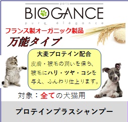 プロテインプラスシャンプー[小麦プロテイン配合] 保湿効果の高い小麦プロテインを配合した基本タイプのシャンプーです。素早く浸透する トリプル・アクション成分による保湿・補修・保護の働きで、しっとりと滑らかな肌触りの 美しい被毛を保ちます。余分な皮脂や汚れを落としながら栄養補給と水分補給をしてくれま すので日常のお手入れにもダメージヘア対策にもお薦めします。pHバランスのとれた低刺激 配合により皮膚がデリケートなペットにも安心してお使いいただけます。 特徴 : しっとりと柔らかく艶やかな仕上り。もつれ・絡みを防ぎます。 被毛タイプ : 全ての被毛タイプにお使いいただけます。子犬・猫にも最適です。