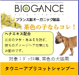 タウニーアプリコット[ニンジンオイル+ヘナ配合] ニンジンオイル+ヘナの配合により被毛本来の自然な発色を整えるシャンプーです。 補修・スムージングのダブルアクションに優れ、被毛本来のコンディションを整えながら潤いのある 輝きを引き立てます。 豊富に含まれたプロビタミンAとヘナの天然色素成分がアプリコット系の 美しい発色を保ちます。pHバランスのとれた低刺激配合により皮膚がデリケートなペットにも 安心してお使いいただけます。 特徴 : 柔らかくシルキーで艶やかな仕上がり。被毛のコンディションを整え清潔に保ちます。 被毛タイプ : ブロンド、アプリコット系の被毛に最適です。子犬用としてもお使いいただけます。