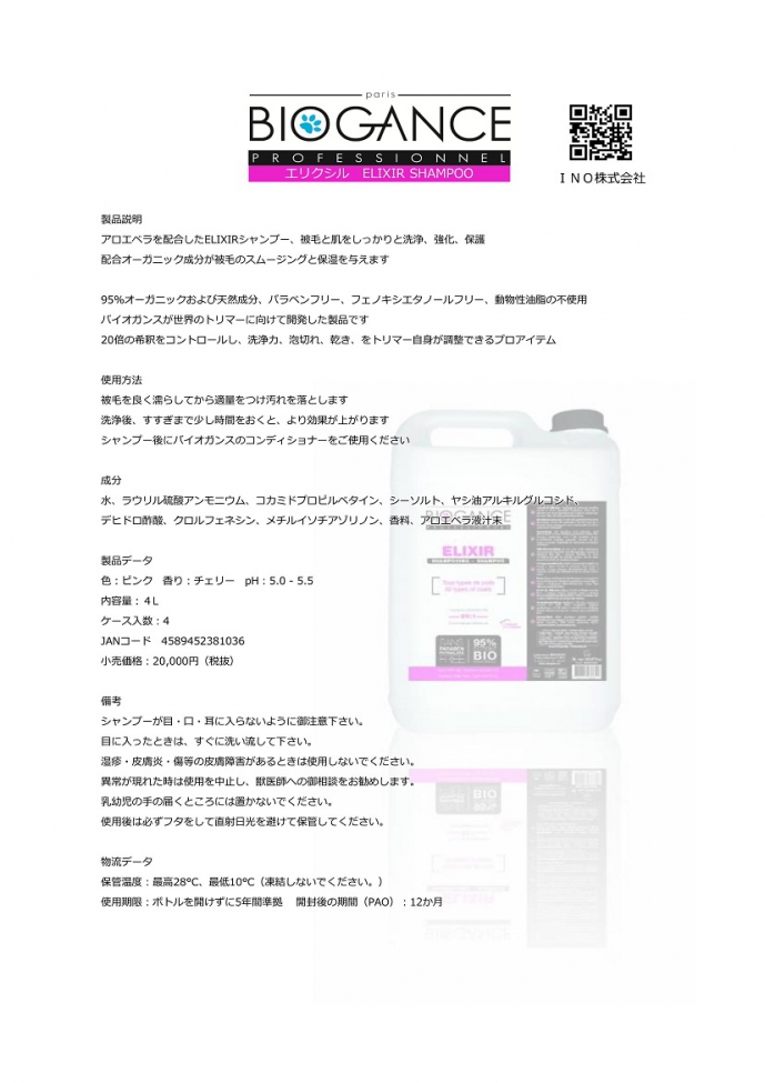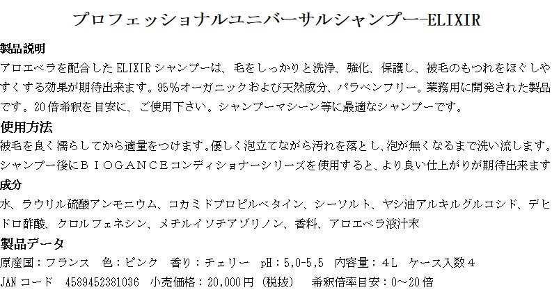 | プロフェッショナルユニバーサルシャンプー-ELIXIR 4L【バイオガンス】 | ○ |