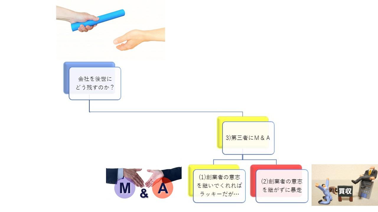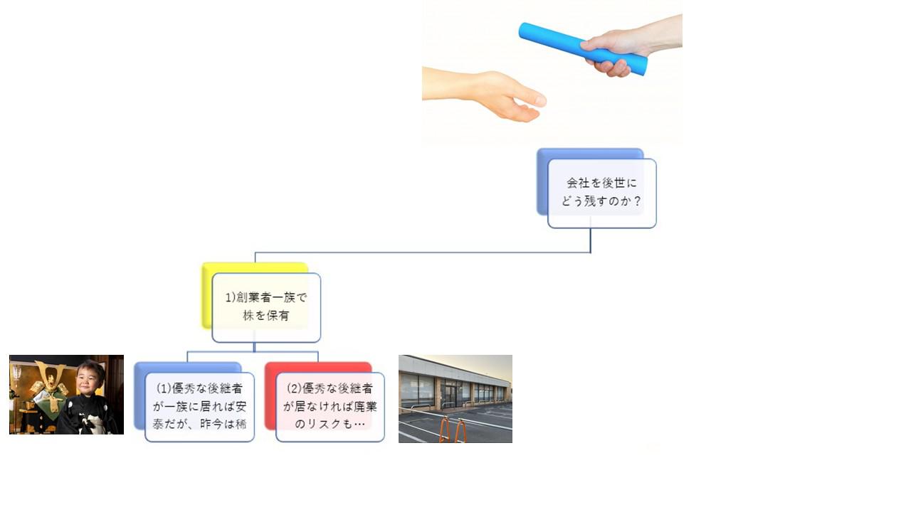 「何十年後も存続?そんな大それたこと、とてもとても」と消極的に考えるのか、「上手にバトンタッチし、末永く世の中に貢献するぞ!」と積極的に考えるのかは、経営者の人生観次第ですが、せっかく経営者が心血注いだ事業ですから、企業が永続することを考えておくのが経営者の(最終的な)大仕事です。