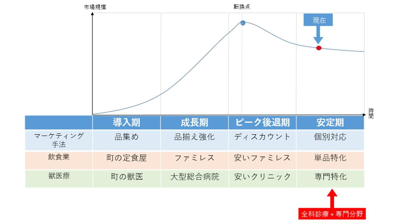 この話は普遍的で、動物病院にも当てはまります。飼育頭数が横ばいや減少に転じている昨今は、動物病院業界も安定期です。獣医療は全科診療(ゼネラリスト的に何でも診る)と言えども、安定期は明確に専門特化した得意分野のある動物病院(スペシャリスト)が勝ち残ります。